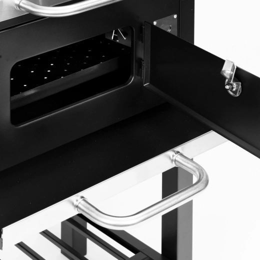 Výsuvný popolník pre rýchle čistenie, predné dvierka na dopĺňanie uhlia, dve bočné police a spodný odkladací rošt pre dokonalú organizáciu.