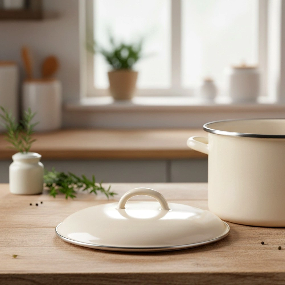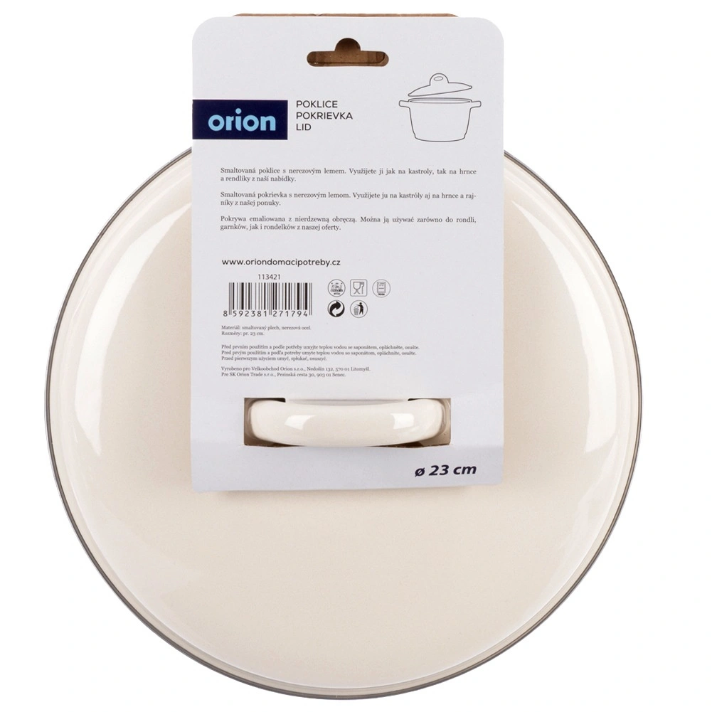 Univerzálna krémová pokrievka s priemerom 23 cm zo smaltovanej ocele na hrnce, panvice a rajnice. Vďaka kovovej obrube a pevnému úchytu výborne tesní, urýchľuje varenie, šetrí energiu a zabraňuje prskaniu. Vhodná aj do umývačky riadu a rúry.