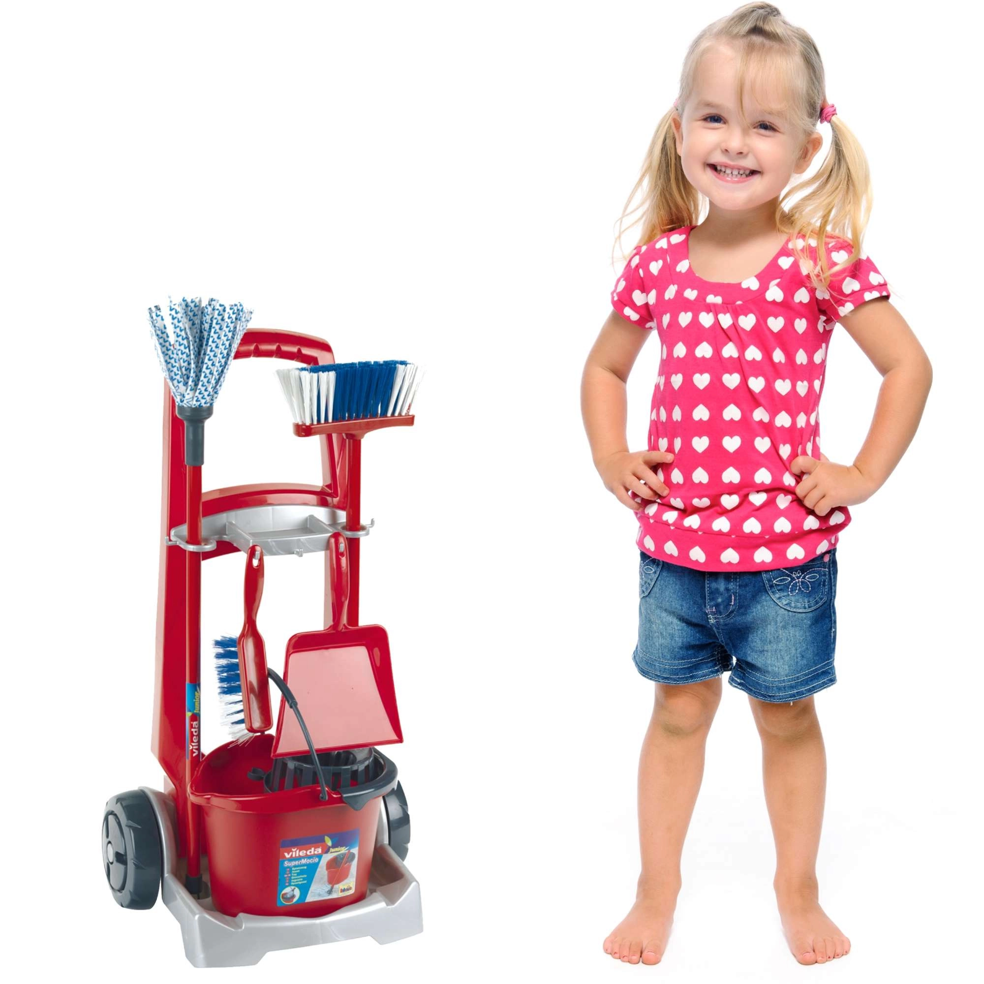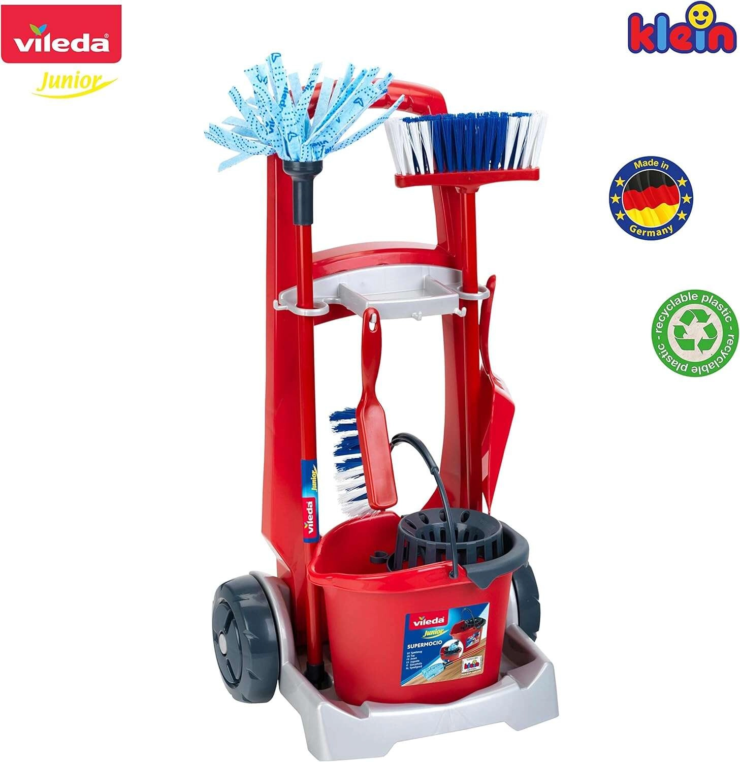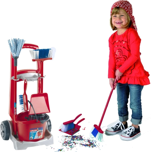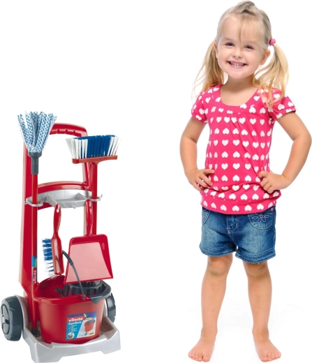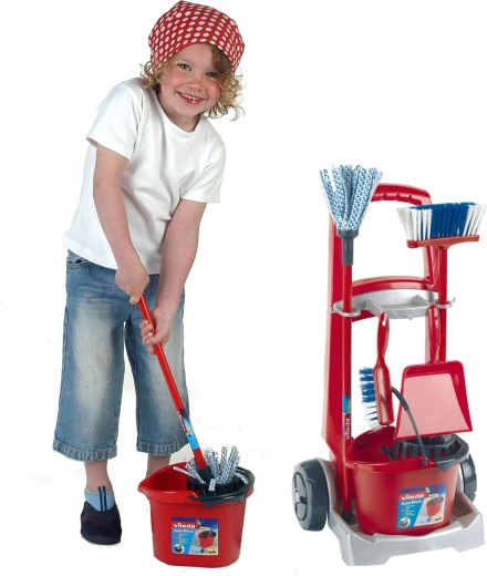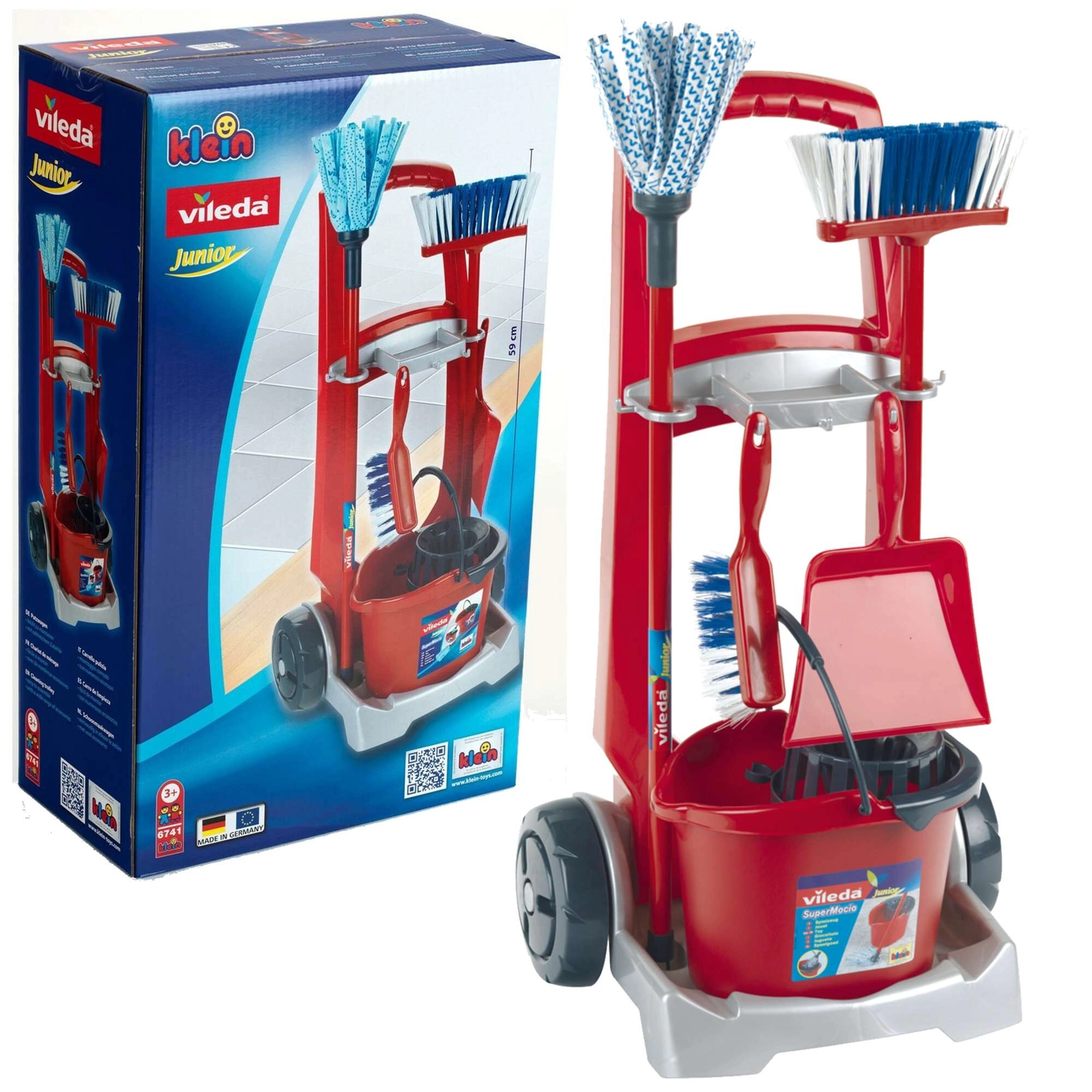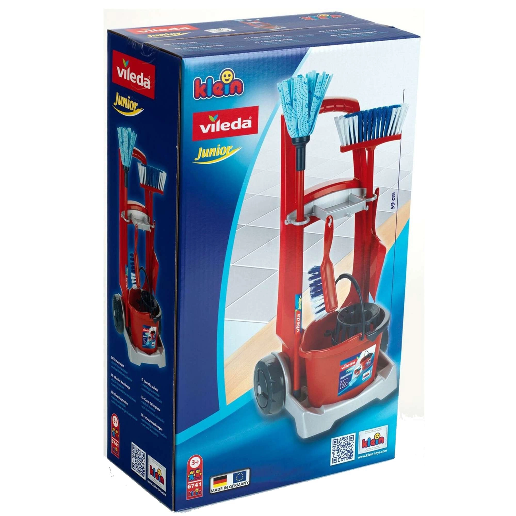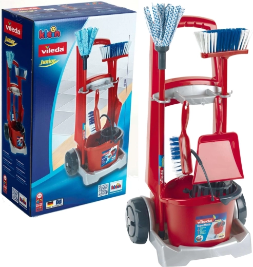Detský upratovací vozík Vileda od značky Klein je bohato vybavená sada na realistickú hru na domácnosť. Obsahuje vozík na kolieskach, vedro s vytláčacím košom, mop, metlu, ručnú kefu a lopatku. Podporuje role-play, učí deti poriadku a zodpovednosti a vďaka odolnému spracovaniu zaručuje dlhú životnosť.