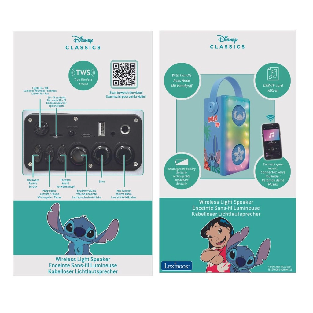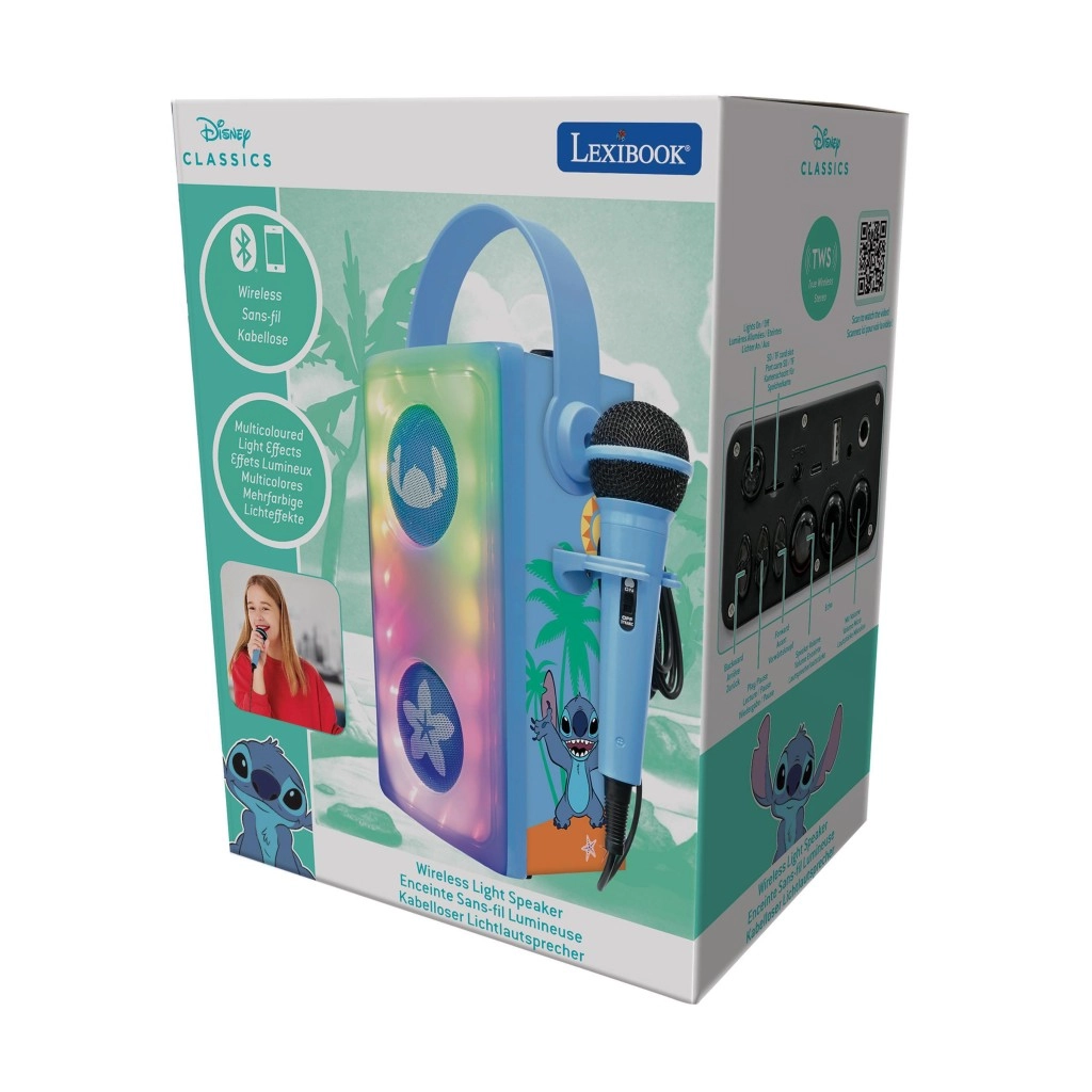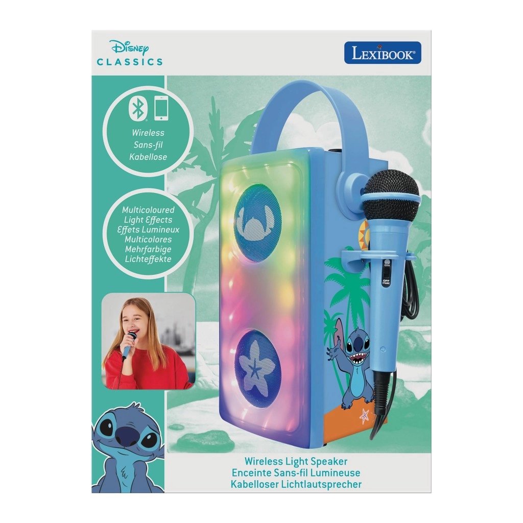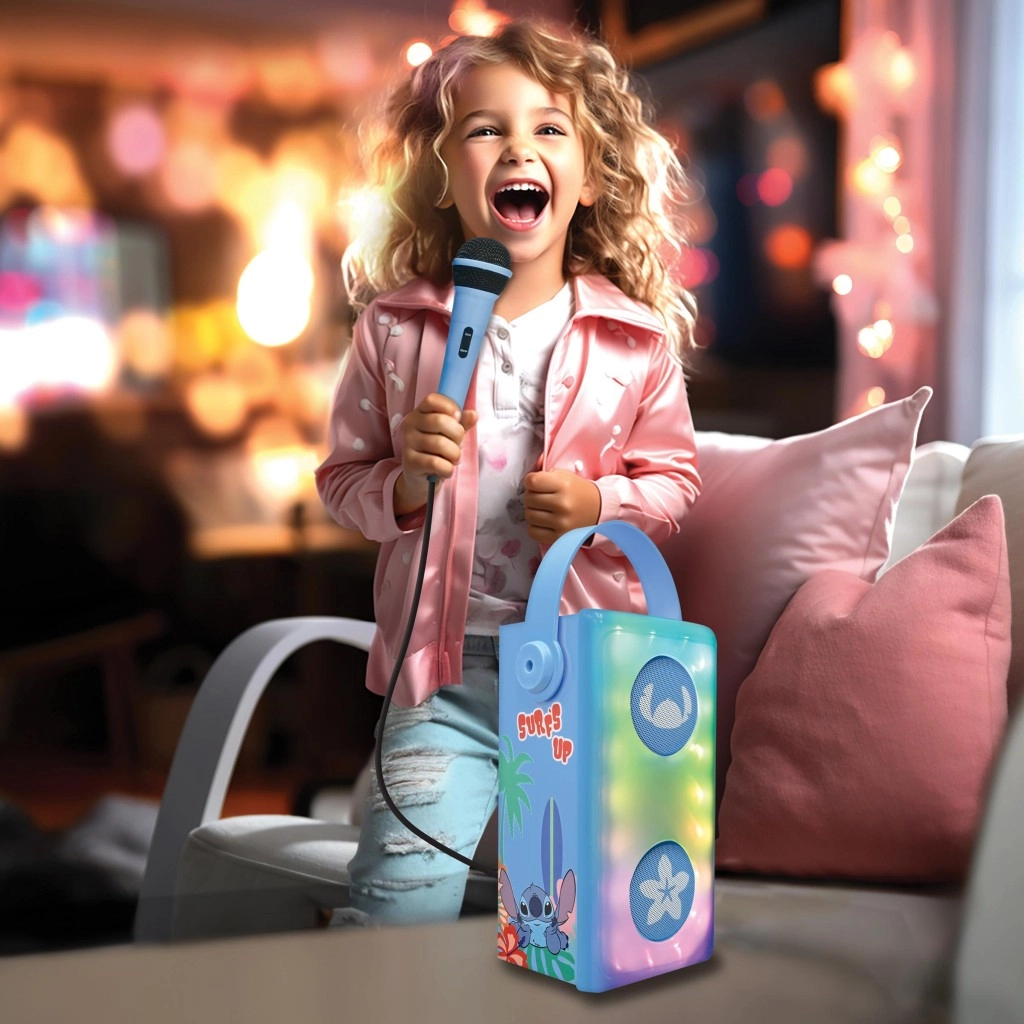Detský karaoke reproduktor LEXIBOOK so sympatickým motívom STITCH je prenosný, zábavný a ľahko ovládateľný spoločník pre malých spevákov. Ponúka Bluetooth pripojenie, prehrávanie z USB, Micro SD/TF aj cez AUX-IN, a súčasťou je drôtový mikrofón s ovládaním a farebné LED efekty pre skvelú atmosféru. Vďaka nabíjateľnej NiMH batérii, praktickému madlu a odolnému prevedeniu je ideálny na doma aj na detské oslavy.