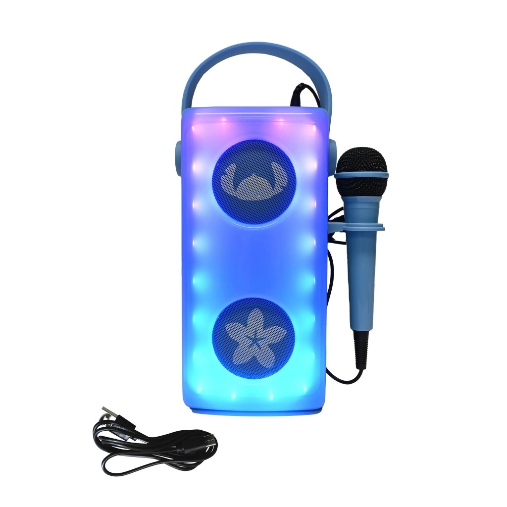 Rozžiarte detské párty aj domáce koncerty štýlovým karaoke reproduktorom LEXIBOOK s motívom STITCH. Dva predné meniče s dekoratívnymi mriežkami a multifarebným LED podsvietením vytvoria pútavú svetelnú show, zatiaľ čo priložený mikrofón podporí detskú kreativitu a sebavedomie pri speve.