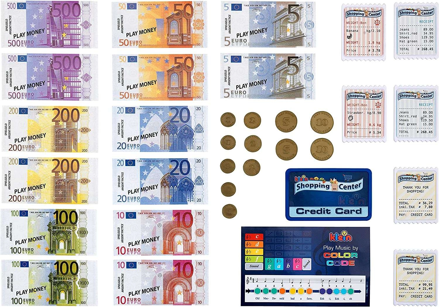 Súprava obsahuje kartónové mince, papierové bankovky, niekoľko účteniek, platobnú kartu a kartičku s pesničkami – všetko pre kompletnú hru na obchod.