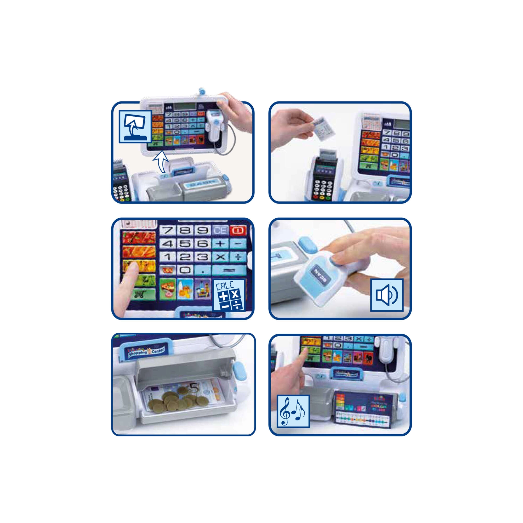 Elektronická pokladňa pre deti napodobňuje skutočnú pokladňu: má prehľadný displej s kalkulačkou, čítačku kariet, skener a výklopný šuplík na hotovosť so známym „cvaknutím“. Deti môžu „naskenovať“ tovar, zadať ceny a nechať pokladňu všetko automaticky sčítať. Dizajn v sivo-bielej farbe pôsobí moderne a čisto.
