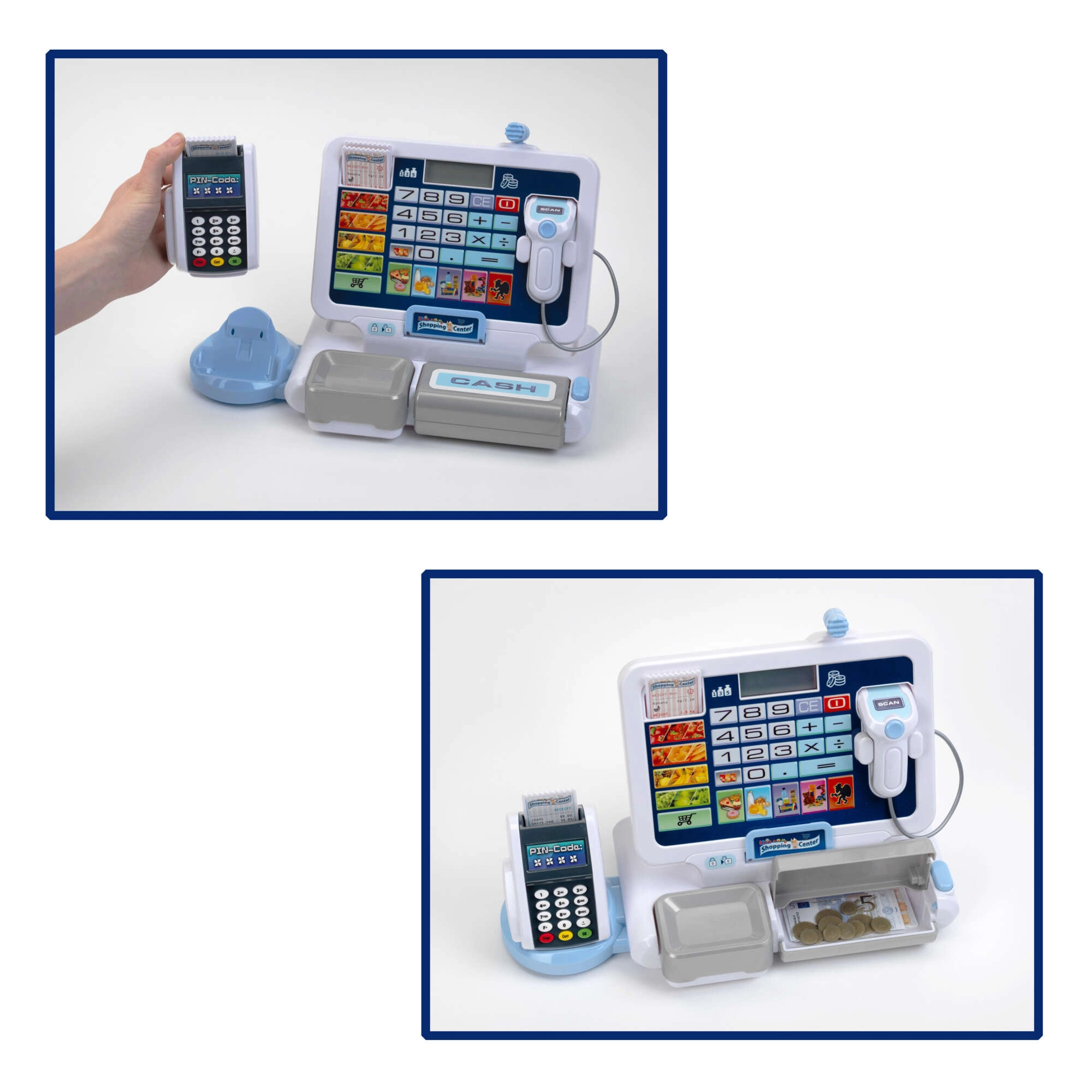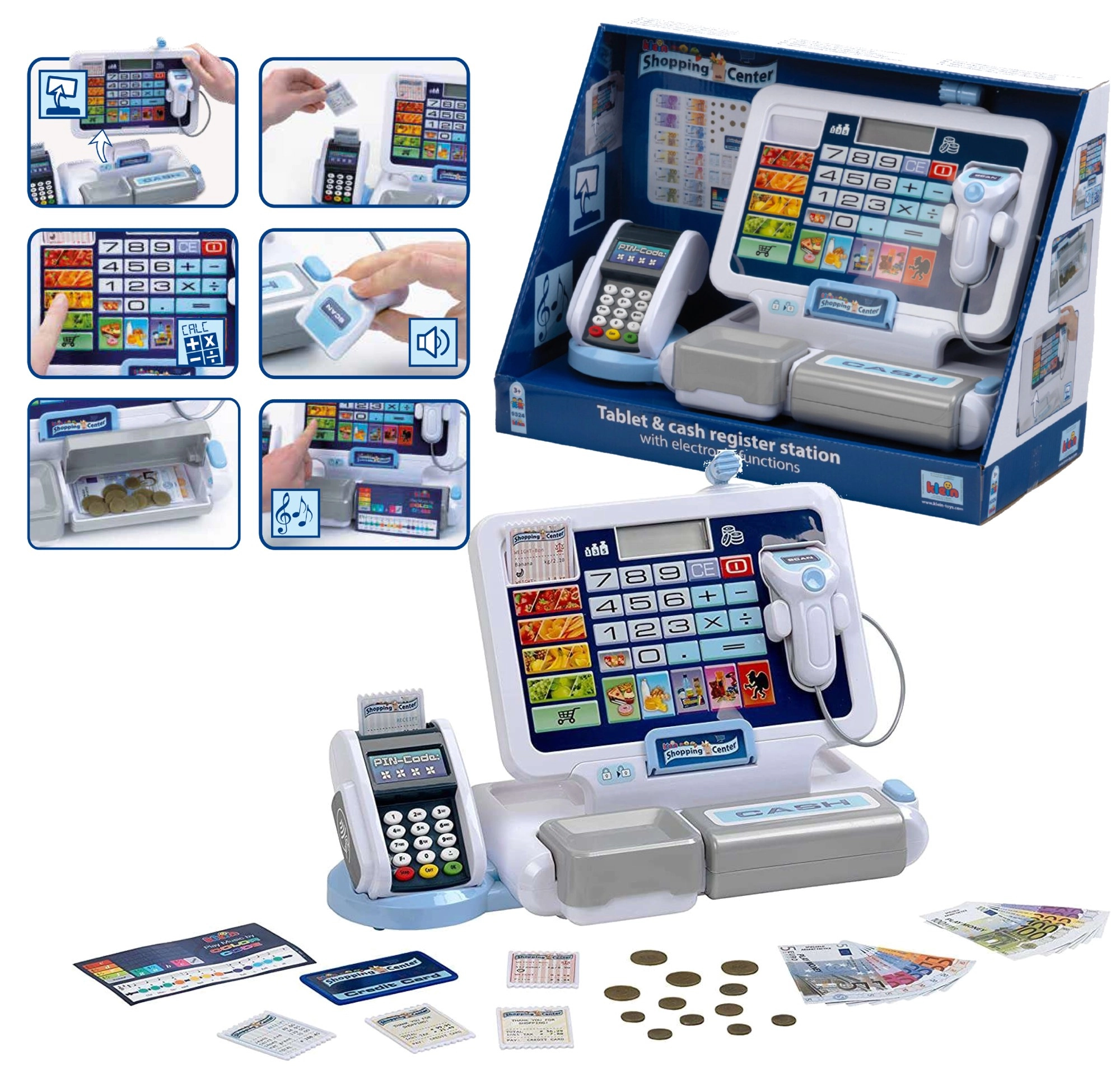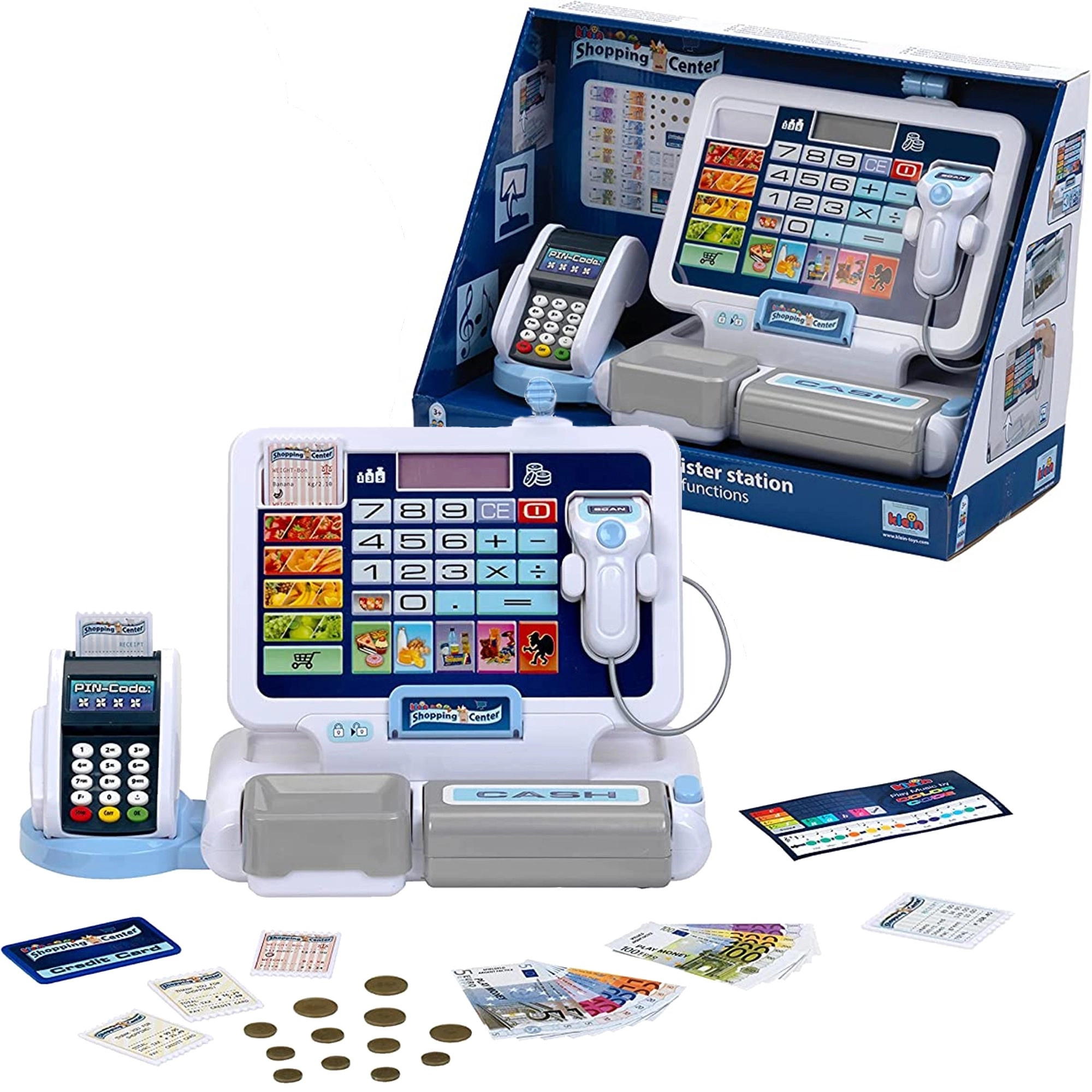 Realistická detská pokladňa s terminálom a skenerom od značky KLEIN prináša autentickú hru na obchod. Ponúka funkčný displej s kalkulačkou, otvárateľný šuplík na peniaze, čítačku kariet, zvukové efekty a bohaté príslušenstvo vrátane euromincí a bankoviek, účteniek aj „kreditnej“ karty – ideálne na rozvoj počítania, finančnej gramotnosti a rolových hier.