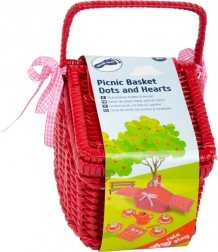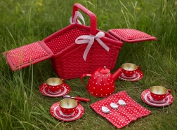 Očarujúci piknikový kôš s motívmi bodiek a srdiečok ukrýva plechovú čajovú súpravu pripravenú na každé imaginárne čajové posedenie. Pevné prevedenie s nastaviteľnými páskami na suchý zips a textilným lemom zabezpečuje ľahké prenášanie aj ukladanie všetkých dielov. Deti si precvičia spoločenskú interakciu, motoriku aj kreativitu.
