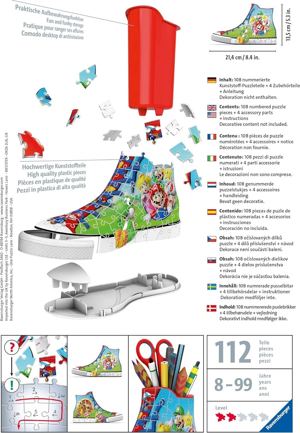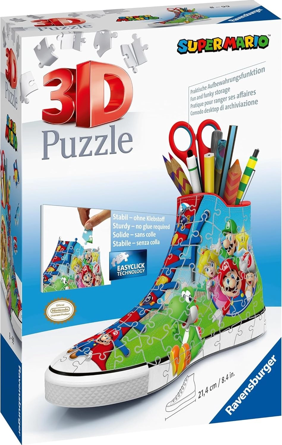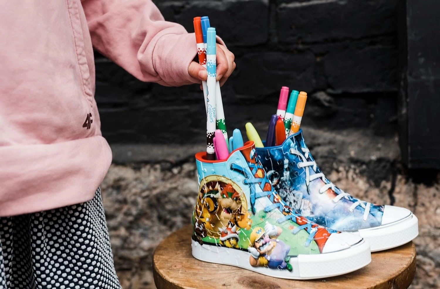 Poskladaj si zo 108 plastových dielikov puzzle túto klasickú tenisku s motívom Super Maria a získaj perfektnú dekoráciu do izby! Po zložení ťa čaká ďalší bonus: môžeš ju použiť na štetce, ceruzky a pod.