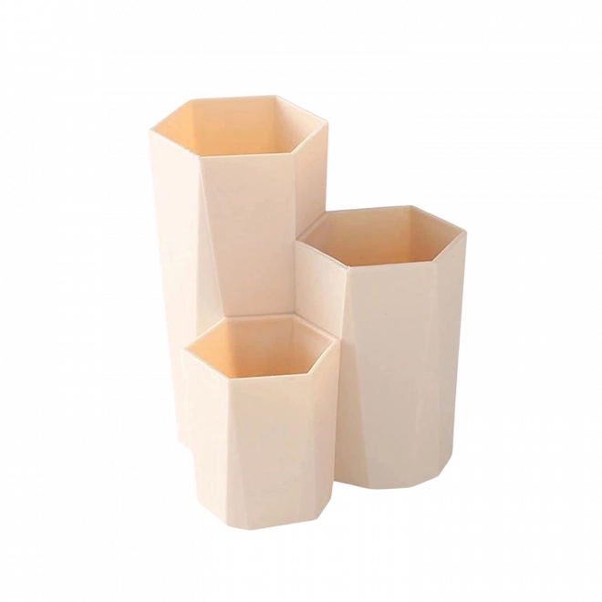 Mimoriadne praktický organizér na štetce a kozmetiku s tromi samostatnými priehradkami. Nádoba je perfektná na uloženie kozmetických doplnkov, ktoré vám doteraz zostávali v kabelke alebo na vašom stole. Vďaka univerzálnemu dizajnu zapadne organizér do interiéru každej miestnosti. Postarajte sa o poriadok ešte dnes. Môžete ho tiež využiť na skladovanie kancelárskych potrieb v pracovni či zubnej kefky v kúpeľni. Všetko bude perfektne zoradené a skvele vyzerajúce, nech už stojan umiestnite kamkoľvek.
