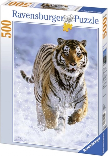 Puzzle zobrazuje nádherný obraz tigra v pohybe na snehu, ktorý upúta svojimi kontrastnými farbami.