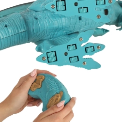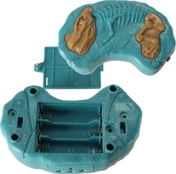 Diaľkový ovládač pripomínajúci skamenelinu s dvoma tlačidlami uľahčuje ovládanie pohybov a zvukov dinosaura.