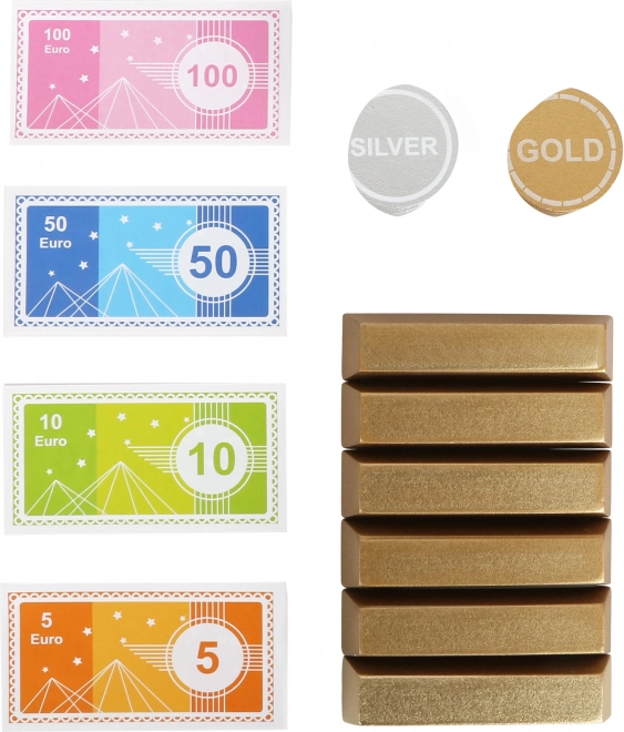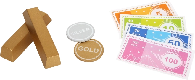 Súčasťou sú euro bankovky, zlaté a strieborné mince aj drevené zlaté tehličky. Skvelé na učenie hodnoty peňazí, počítanie a role-play bankárov aj zákazníkov.