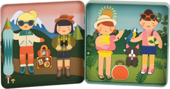 Zábavná magnetická knižka do vrecka pre malých cestovateľov. Vďaka viac než 25 magnetkám môžu deti mixovať dieliky a vytvárať postavičky, objavovať dve scenérie vo vnútri a rozvíjať predstavivosť a jemnú motoriku. Praktická plechová krabička sa pevne zatvára, takže je ideálna na cesty.