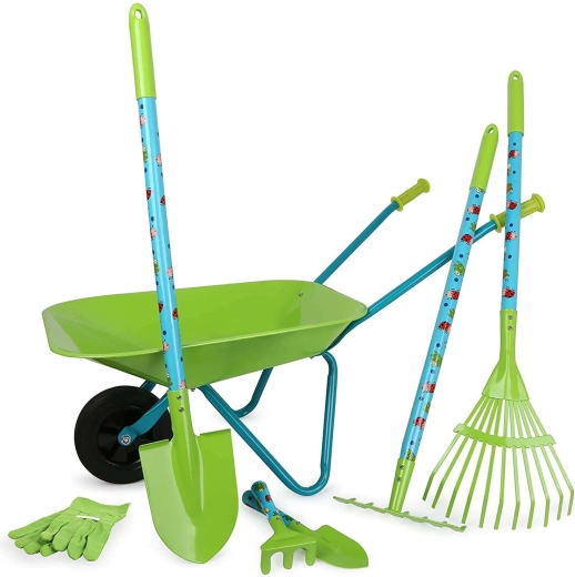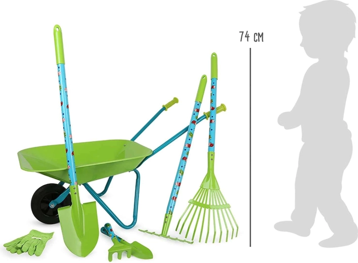 Táto veľká detská záhradnícka sada SMALL FOOT prináša všetko, čo malý záhradník potrebuje: stabilný fúrik, lopatu, hrable, hrable na lístie, malé hrable, lopatku a ochranné rukavice. Väčšina dielov je z kovu, takže sú pevné a trvácne, zároveň však ľahké a dobre ovládateľné pre detské ruky.