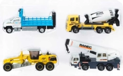 - Sada obsahuje nasledujúce vozidlá z kolekcie Matchbox Working Rigs: GMC 3500 Attenuator Truck, MBX Mobile Crane, Road Grader a Cement King.