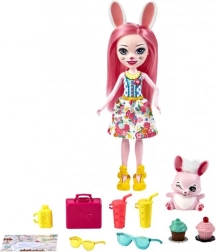 Bábika Bree s dlhými ružovými vlasmi a králičími ušami je pripravená na cestu. Jej outfit zahŕňa letné šaty s kvetinovým potlačou, topánky a slnečné okuliare.