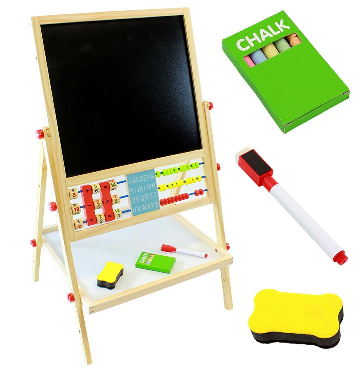 Táto drevená obojstranná tabuľa je ideálna pre malé deti na učenie sa a zábavu. Ponúka rôzne možnosti využitia, vrátane kreslenia kriedou a fixkami.