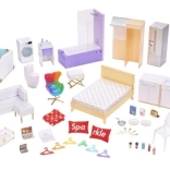 Posteľ, sedačka, jedálenský set, vaňa a kuchynské doplnky – všetko zladené do štýlu RAINBOW HIGH na okamžité hranie.