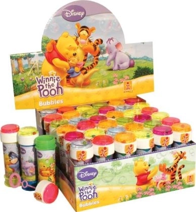 Bublifuk s motívom Medvedíka Pú s objemom 60 ml. Súčasťou farebného viečka je hra a fúkadlo. Možno zakúpiť aj ako celý displej, kde je 36 ks.