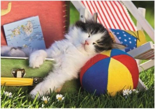 Farebný obrázok spiaceho mačiatka s loptou motivuje deti k skladaniu a zdobí každú detskú izbu.