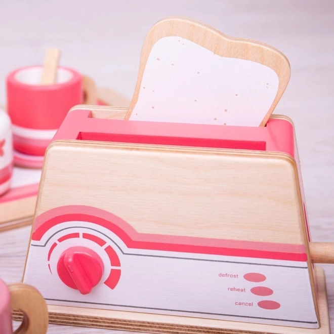 Drevený hriankovač Bigjigs Toys v príjemnej ružovej kombinácii prinesie do detskej kuchynky veľa radosti. Vďaka otočnému voliču a funkčnej páčke deti ľahko napodobnia skutočné opekanie chleba, čo podporuje napodobňovaciu hru, jemnú motoriku aj fantáziu.