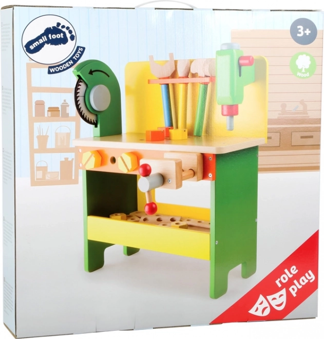 Detský drevený ponk Small Foot Christian je kompletne vybavená mini dielňa, ktorá nadchne každého malého remeselníka. Súčasťou je odnímateľná vŕtačka, píla, zverák, kladivo, skrutkovač, kľúče, skrutky aj dierované doštičky. Vďaka premyslenému rozvrhnutiu je všetko pekne po ruke a deti si precvičia jemnú motoriku aj trpezlivosť.