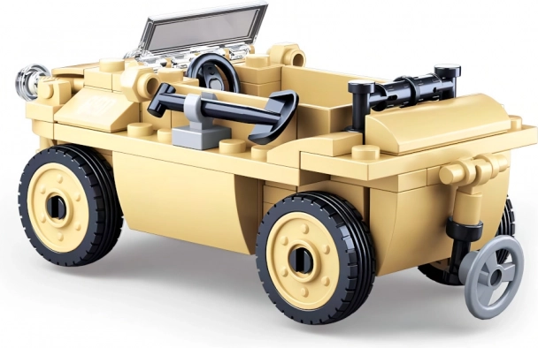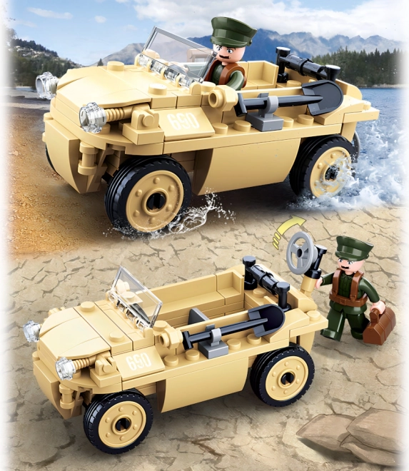 Stavebnica ponúka detailnú repliku nemeckého obojživelného vozidla, obohatenú o realistické prvky ako čelné sklo a pohyblivé kolesá.