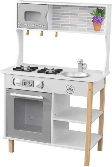 Štýlová drevená kuchynka KidKraft premení detskú izbu na malé bistro. Ponúka realistické otočné gombíky s cvakaním, otváracie dvierka rúry a mikrovlnky a 38 ks príslušenstva. Vďaka odnímateľnému drezu na jednoduché čistenie, policiam a háčikom má všetko svoje miesto. Vhodné od 3 rokov. Rozmery 59,9 × 34,29 × 90 cm.