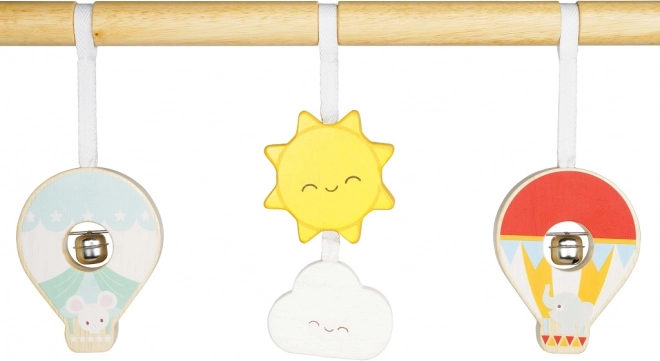 Táto stabilná a bezpečná detská hrazdička je vytvorená z vysoko kvalitného dreva s ohľadom na bezpečnosť detí. Farebné hračky v tvare oblakov, pohorí a horkovzdušných balónov sú zavesené na textilnej šnúre a jemne zvonia.