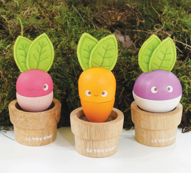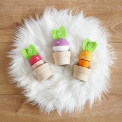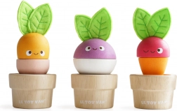 - 3 drevené kvetináčiky, zeleniny s vymeniteľnými dielmi (mrkva, reďkovka, repa) s plstenými lístkami