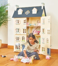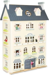 Palácový domček pre bábiky LE TOY VAN je výnimočná hračka a dizajnový kúsok v jednom. Na každej strane nájdete množstvo okien, niektoré možno otvoriť rovnako ako nádherné vstupné dvere v kráľovskej modrej. Osem štýlových miestností zdobia elegantné nástenné dekorácie a veľké centrálne schodisko siahajúce až do štvrtého poschodia. Oddeliteľná strecha odhaľuje priestranné podkrovie prístupné rebríkom – ideálne na herné scenáre aj ako úložný kút.