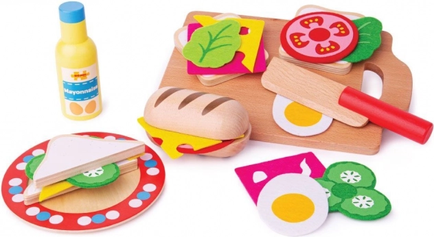 V sade nájdete všetko pre prípravu chutného sendviča: bagetku, plátky chleba, majonézu, šalát, uhorku, syr, vajce a paradajku, doplnené o tanier, doštičku a nôž. Materiály pochádzajú z zodpovedných zdrojov a hračka spĺňa európske bezpečnostné normy, takže sa na ňu môžete spoľahnúť.