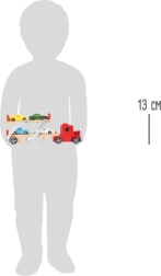 Pozor, nakladá sa! Tento robustný drevený kamión s autami od značky small foot prepraví až štyri športové autíčka naraz. Má pohyblivú hornú plošinu na ľahké nakladanie a vykladanie, bezpečnostnú závoru proti cúvnutiu a odolné prevedenie z kvalitného dreva a kovu – ideálne pre malých fanúšikov áut a každú detskú autodráhu.