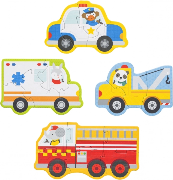 Zoznámte deti so svetom záchranárov pomocou milých ilustrácií – králik šoféruje sanitku, opica policajné auto, slon hasičské vozidlo a panda odťahovku. Rôzna náročnosť skladačiek (3, 4, 5 a 6 dielikov) podporuje postupný rozvoj zručností, trpezlivosť aj radosť z úspechu.