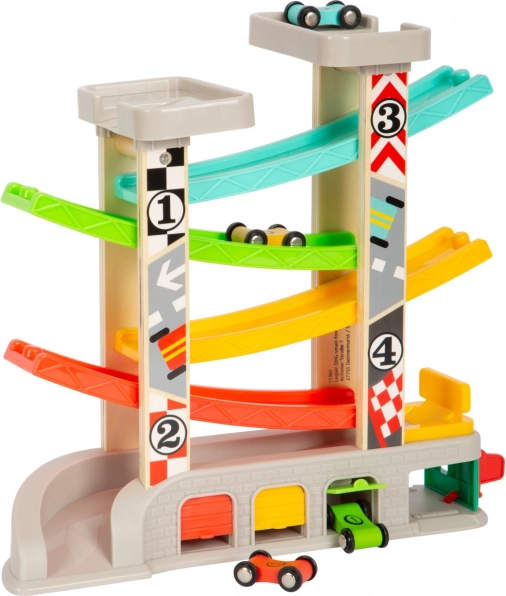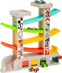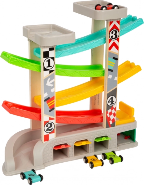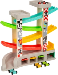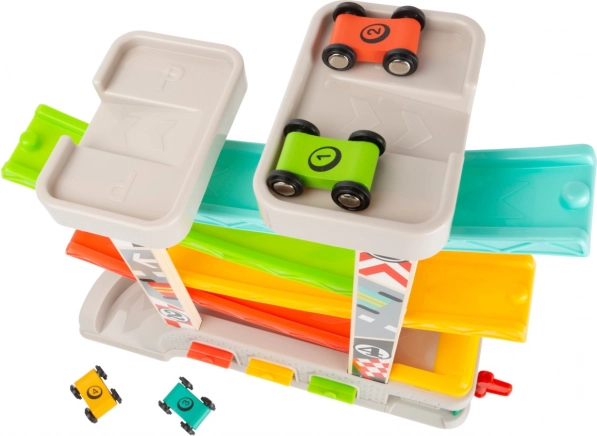 Závodná dráha obsahuje rôzne úrovne a farebné autíčka, čo zabezpečuje zábavné a vzdelávacie hranie.
