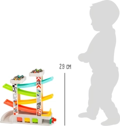 Dráha je navrhnutá tak, aby rozvíjala zručnosti imitačného hrania a jemné motoriky, zatiaľ čo deti závodia so štyrmi rôznofarebnými autíčkami. Navyše, vďaka praktickému systému parkovania a skladovania môžu malí závodníci po závode svoje autíčka jednoducho upratať.