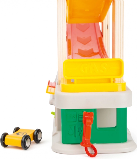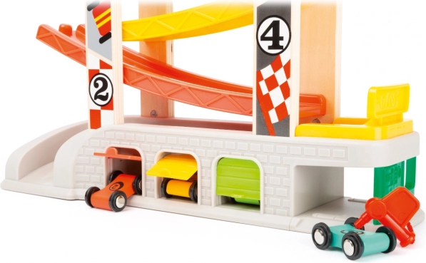 Predstavujeme závodnú dráhu, ktorá zaručuje hodiny zábavy pre vaše deti. Táto sada obsahuje nielen závodnú dráhu, ale aj tri garáže a tankovací box, čo umožňuje simulovať rôzne scenáre a hry. Vďaka svojej jedinečnej farebnosti dráha ľahko upúta pozornosť a podnecuje detskú zvedavosť. Robustná konštrukcia kombinuje plastové a atraktívne potlačené drevené diely, čo zaisťuje dlhodobú odolnosť.