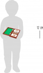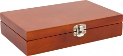 Pevná drevená schránka s kovovou západkou chráni karty aj kocky. Ľahko sa zmestí do batohu či kufra.