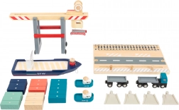 Táto premyslená prístavná stavebnica prináša deťom realistickú hru na logistiku: loď s dvoma remorkérmi je pripravená na vyplávanie, zatiaľ čo žeriav prekladá farebné kontajnery vďaka integrovaným magnetom. Robustné drevené diely a plynulé funkčné prvky podporujú jemnú motoriku, predstavivosť a trpezlivosť.