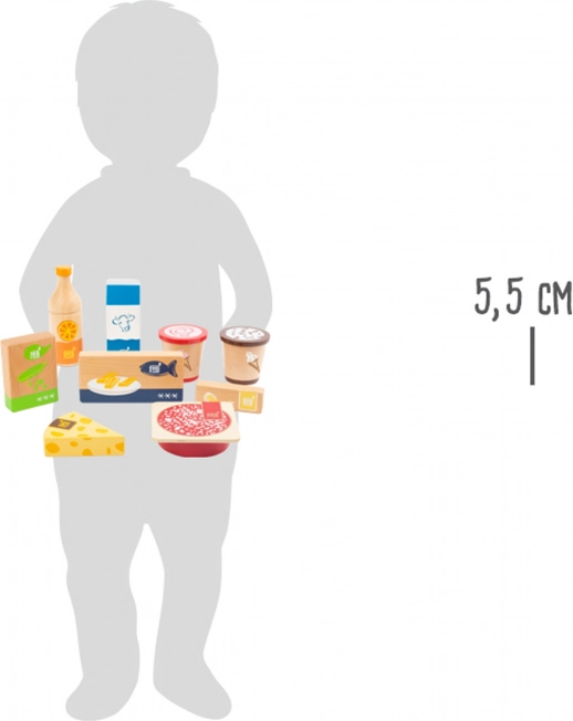Set obsahuje pomarančový džús, dve balenia zmrzliny, balenie hrášku, rybie prsty, maslo, syr, krájaný salám a krabicu mlieka. Realistické potlače a prírodný vzhľad zaujmú na prvý pohľad. Vďaka pevnému drevu je sada odolná a pripravená na každodenné hranie.