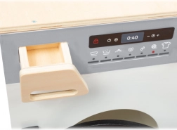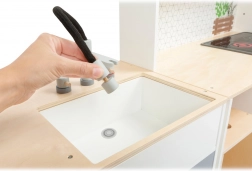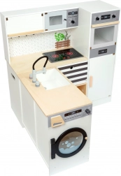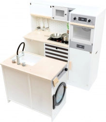 Kuchynka zahŕňa sporák, rúru, mikrovlnnú rúru, chladničku aj bohaté úložné skrinky s dvierkami. Ostrovček je vybavený drezom, práčkou a umývačkou. Súčasťou balenia je tiež kvalitné kovové riady na okamžitú hru. Vďaka robustným materiálom (drevo, plast, kov) je kuchynka stabilná a odolná – ideálna na každodenné hranie detí od 3 rokov.