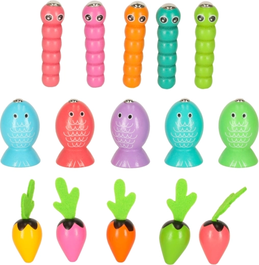 Každý prvok je vyrobený z kvalitného dreva, starostlivo vyhladený a opatrený bezpečnými, netoxickými farbami. Magnetická šnúrka na prúte vyžaduje jemné vedenie ruky, čo skvele trénuje jemnú motoriku a koordináciu ruka–oko. Vďaka príjemným farbám a rôznym povrchom hra zaujme a podporí zmyslové vnímanie.