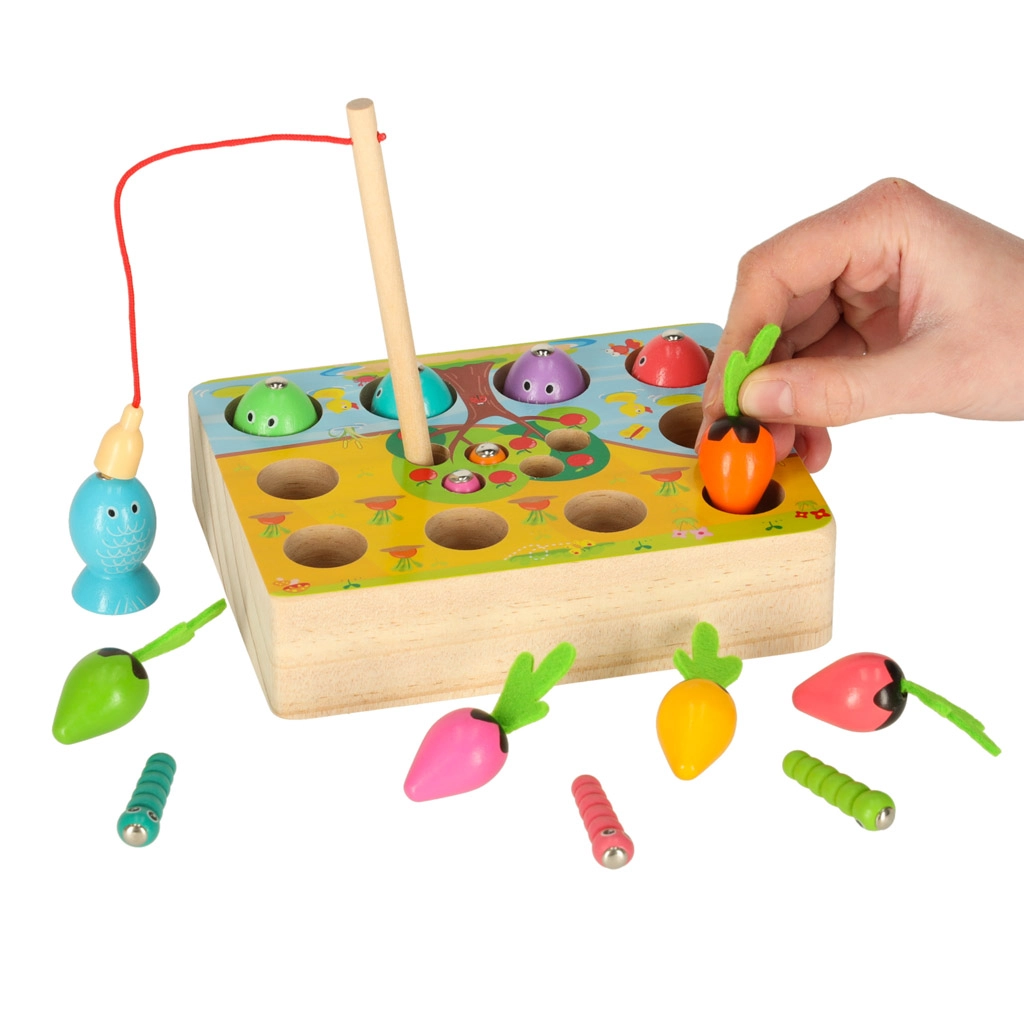 Táto multifunkčná drevená sada prenesie deti k rybníku aj do záhradky – a to priamo doma. S magnetickým prútom budú malí rybári loviť rybičky a červíky z pripravených otvorov, zatiaľ čo malých záhradníkov čaká zber farebných mrkvičiek za mäkké plstené lístky. Hra prirodzene rozvíja sústredenie, presnosť pohybov a učí deti rozlišovať farby.