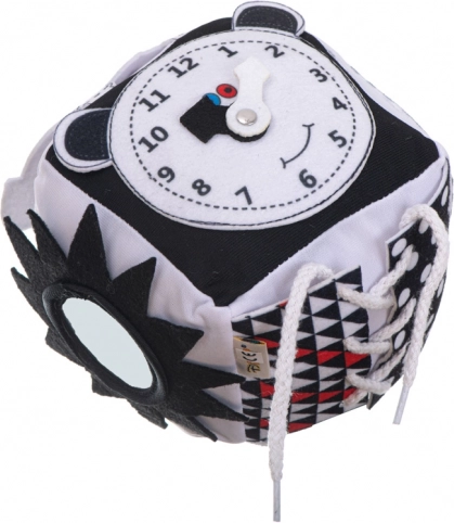 Táto mäkká senzorická kocka urobí každý deň vášho malého objaviteľa úžasným. Kontrastné vzory a čiernobiele farby stimulujú zrak, zatiaľ čo rôzne textúry pomáhajú v rozvoji hmatu. Kocka je vybavená hrkálkou a praskavými prvkami, ktoré zaujmú sluch aj tých najmenších.