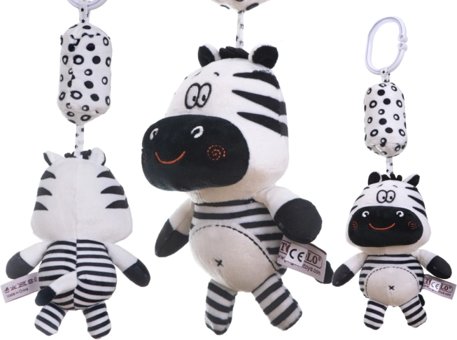 Plyšový prívesok zebra upúta pozornosť dieťaťa nielen svojou charakteristickou čiernobielou farbou, ale aj zvukom lahodiacim uchu. Maskot má univerzálny držiak, ktorý umožňuje pripevniť ho kdekoľvek, doma alebo na cestách. Ďalšou zábavou pre dieťa sú chrastiace prvky a rôzne textúry.