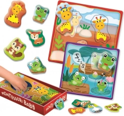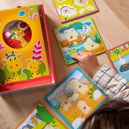 Objavte hravú didaktickú sadu, v ktorej deti skladajú mláďatá k ich mamičke a ockovi, spoznávajú zvieratká aj ich prirodzené prostredie a pritom trénujú trpezlivosť, pozornosť a jemnú motoriku. Sada je navrhnutá pre najmenších – jednoduché obrysové dieliky sa deťom dobre držia a ľahko vkladajú.