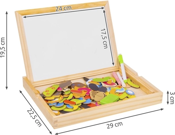 Prineste svojim deťom hodiny zábavy a kreatívneho učenia s touto drevenou magnetickou doskou! Doska ponúka dve strany: čiernu pre kreslenie kriedou a bielu pre písanie fixkou alebo aranžovanie magnetických obrázkov. Vďaka brožúre s príkladmi môžu deti vytvárať rôzne vzory a motívy.