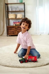S šikmým prívesom a otváracou zadnou a bočnou klapkou poskytuje traktor veľa možností pre rozvoj motoriky a kreativity. Svetelné a zvukové funkcie, vrátane osvetlených reflektorov a reálnych zvukov traktora, poháňajú 2 x AAA batérie (súčasť balenia). Vhodný na hranie doma aj vonku vďaka pevnému prevedeniu a dĺžke 26 cm. Odporúčané pre deti od 3 rokov.