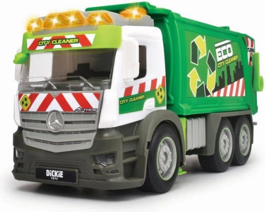 Objavte mestské upratovanie so štýlovým smetiarskym autom Mercedes. Deti si zamilujú realistické spracovanie s funkčnými svetlami a zvukmi, ktoré umocňujú zážitok z hry. Vyklápacia korba a priložený kontajner umožnia naložiť a vysypať „odpad“ ako v skutočnosti.