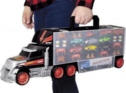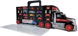 Obrí kamiónový kufrík kombinuje úložný box a herný set v jednom. Otvárateľné priehradky pojmú celú sadu vozidiel aj doplnkov a praktická rukoväť uľahčí prenášanie. Manuálna launchovacia mechanika v kabíne premení kamión na pretekársku dráhu a postará sa o akčné štarty.