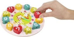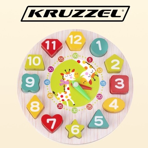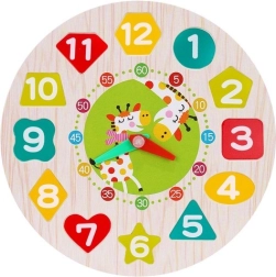 Táto drevená edukačná hračka spája hru a učenie v jednom. Okrúhly podstavec s číslami 1–12 v rôznych tvaroch učí deti priraďovať tvary, rozpoznávať farby a číslice, zatiaľ čo pohyblivé hodinové a minútové ručičky pomáhajú pochopiť celé hodiny aj minúty. Odolné drevené diely sú príjemné do ruky a bezpečne opracované.