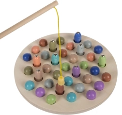 Táto drevená magnetická hra lovenie rybičiek je skvelou voľbou pre rozvoj detských zručností. Deti chytajú farebné rybičky pomocou magnetického prúta, triedia guľôčky a trénujú manipuláciu so štipcami a tyčinkami. Podporuje logické myslenie, pamäť a zručnosť a zároveň prináša množstvo radosti.